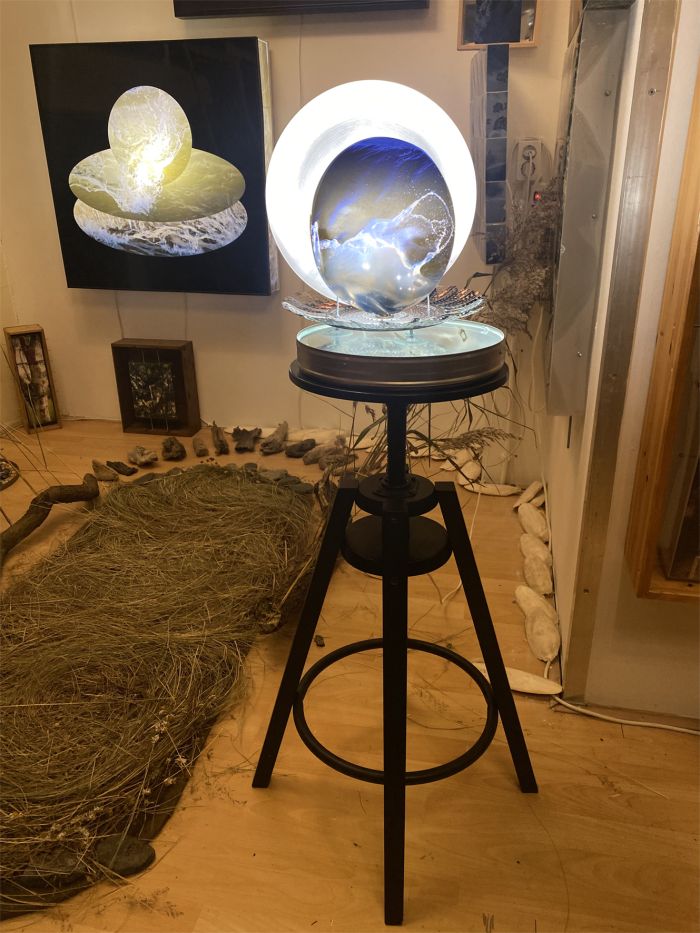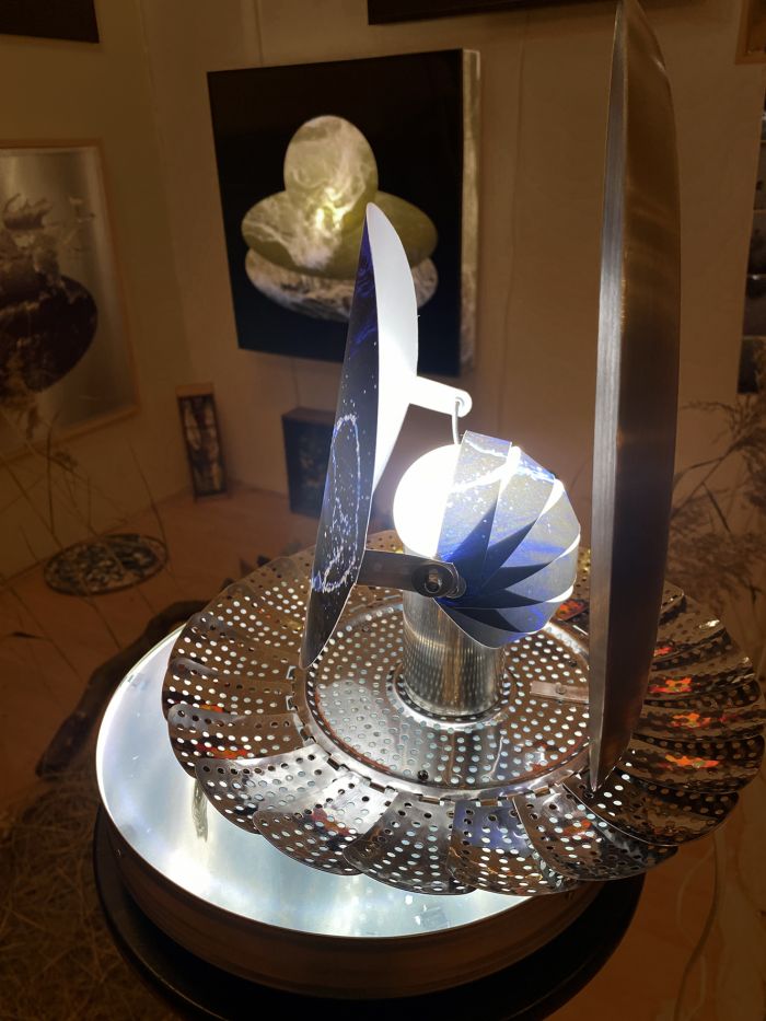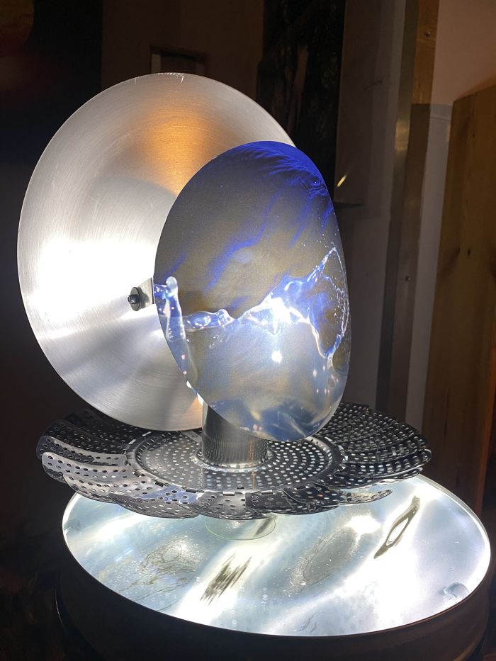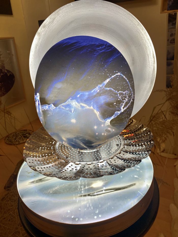 Sea Stars: Dit foto licht-object is weer heel anders dan mijn eerder werk. Van de serie Watersterren is deze een andere presentatie. In de winter van 2022 zat ik graag bij een olie kachel, de straling van de warmte deed me goed. De kleuren van de vlam zijn hemels blauw en warm geel en rood. Deze combinatie wilde ik gebruiken voor een foto-object met licht. De kleur blauw van deze Waterster kwam het beste overeen. Door de reflectie van het metaal kunnen er ook andere kleuren komen in combinatie met de foto’s. Het lichtval in de golven van de zee leken net sterren.